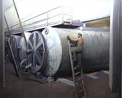 Oberteil: Ein Transportrechen bringt die Schnitzel über schräge Schurren in die "Diffuseure". Extraktion mit warmen Wasser liefert den Rohsaft. Seit den 50er Jahren durch kontinuierliche Anlagen (Turm, Tröge) allmählich verdrängt.